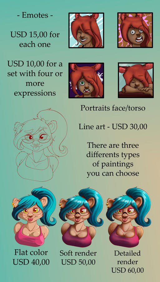 ___________________________________Q: What do I need to send you to get a commision done?A: Send me all the characteristics of your character, including personality traits, so I can draw them with utmost respect and accuracy as possible. The more thorough the description, the better.Q: Do you draw full body commissions?A: Yes, I do!Q: Do you make furry commissions?A: It's not my main line of work, but I can do it!Q: Do you make NSFW drawings?A: I can do that, yes, but it will require a lot more time to get it done.Q: How do I pay you, and how does the payment work?A: PayPal is my way to go! If you are interested in my work, I ask for half of the value in advance and the rest after the commission is done. It's a security measure for me and for you as well. For convenience, I can send you an invoice through Paypal as well!Q: How long do you take to finish a commission?A: I'm asking for at least two weeks. If I take too long to finish it, I'll upgrade your painting and add some extra details free of charge.Q: How do you work? Slots? Queue?A: Queue! I want to do as much art as I can, so I'll keep the queue open. I'll contact you via e-mail and send you a link to my business discord (If you want quicker feedback, but it's not necessary if you don't) so I can keep you posted on the commission progress. If you don't receive any message for me, please have faith! I'll reach out to you as soon as I finish the previous commission.That's it! I'm open to further questions, and if you are interested, please send an email to [email protected] and let's work together!