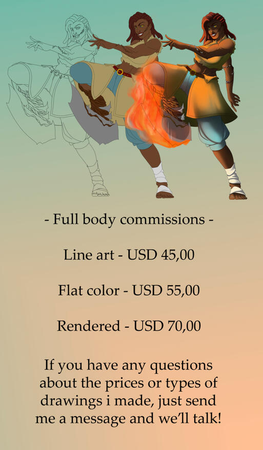 ___________________________________Q: What do I need to send you to get a commision done?A: Send me all the characteristics of your character, including personality traits, so I can draw them with utmost respect and accuracy as possible. The more thorough the description, the better.Q: Do you draw full body commissions?A: Yes, I do!Q: Do you make furry commissions?A: It's not my main line of work, but I can do it!Q: Do you make NSFW drawings?A: I can do that, yes, but it will require a lot more time to get it done.Q: How do I pay you, and how does the payment work?A: PayPal is my way to go! If you are interested in my work, I ask for half of the value in advance and the rest after the commission is done. It's a security measure for me and for you as well. For convenience, I can send you an invoice through Paypal as well!Q: How long do you take to finish a commission?A: I'm asking for at least two weeks. If I take too long to finish it, I'll upgrade your painting and add some extra details free of charge.Q: How do you work? Slots? Queue?A: Queue! I want to do as much art as I can, so I'll keep the queue open. I'll contact you via e-mail and send you a link to my business discord (If you want quicker feedback, but it's not necessary if you don't) so I can keep you posted on the commission progress. If you don't receive any message for me, please have faith! I'll reach out to you as soon as I finish the previous commission.That's it! I'm open to further questions, and if you are interested, please send an email to [email protected] and let's work together!